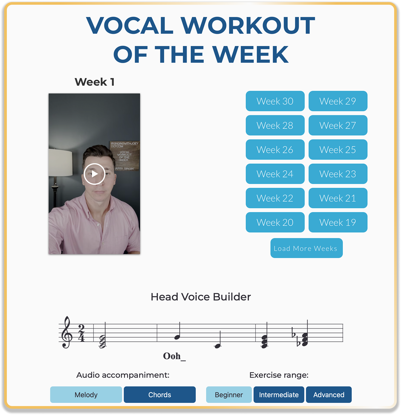 This is our completely customizable vocalizing tool you can use for your own singing or share with your students. Each week of the Vocal Workout of the Week provides a comprehensive vocal warm up that will sequentially build your skills.